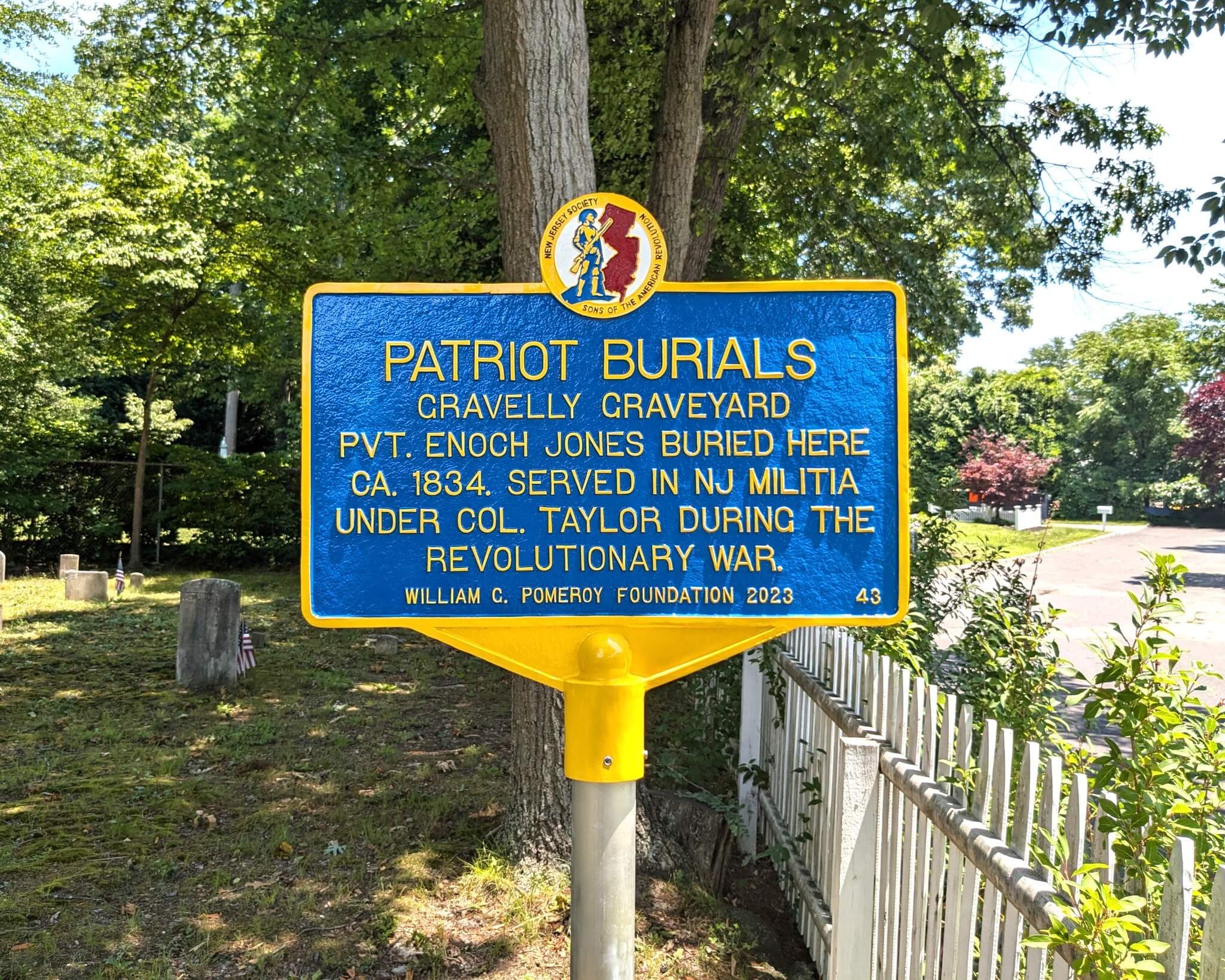 The Gravelly Graveyard, also known as the Old Wooley Cemetery, is the final resting place of many of the area’s early residents. Among those buried here is Private Enoch Jones, who served in the New Jersey Militia for nine months during the Revolutionary War. During that time, he participated in several skirmishes against the Pine Robbers, who were British sympathizers and opportunists who conducted guerrilla attacks against several New Jersey communities, using the densely forested Pine Barons as their base of operations.