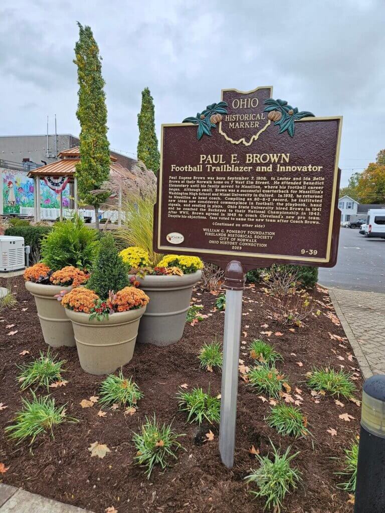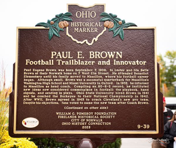 Paul Eugene Brown was born September 7, 1908, to Lester and Ida Belle Brown at their Norwalk home on 7 West Elm Street. He attended Benedict Elementary until his family moved to Massillon, where his football career began. Although small, Brown was a successful quarterback for Massillon’s Washington High School and Miami University in Oxford. In 1932, he returned to Massillon as head coach. Compiling an 80-8-2 record, he instituted new ideas now considered commonplace in football: the playbook, hand signals, and sending in plays. Ohio State University hired Brown in 1941 and he coached the Buckeyes to their National Championship in 1942. After WWII, Brown agreed in 1945 to coach Cleveland’s new pro team. Despite his objections, fans voted to name the new team after Coach Brown. (continued to other side)