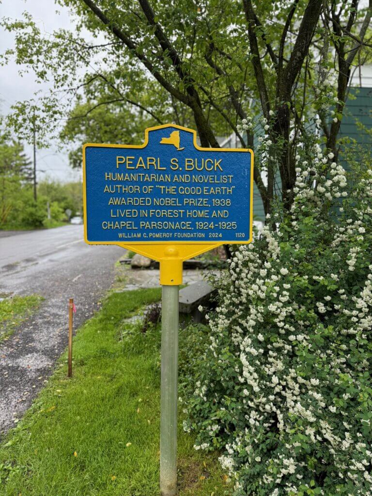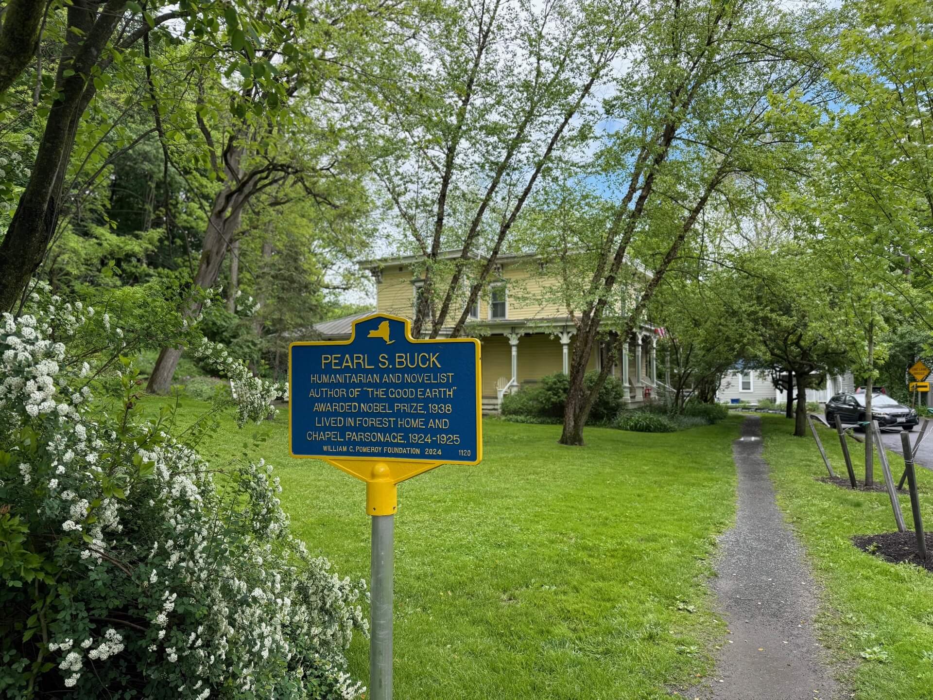 This historical marker, located in Ithaca, New York, sits at a site that comes before her international acclaim. When, from 1924 to 1925, Pearl S. Buck and her husband at the time, agricultural economist John Lossing Buck, lived in Forest Home as they attended graduate school at Cornell University.