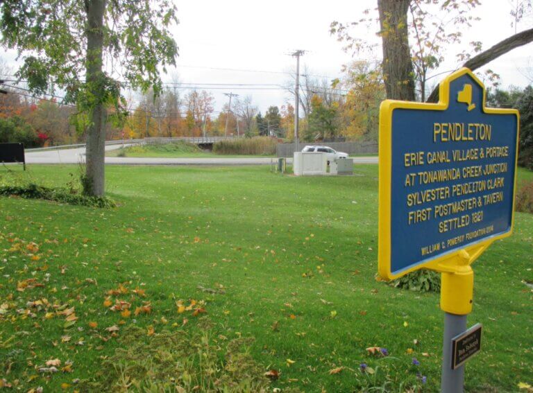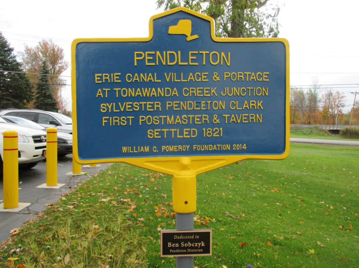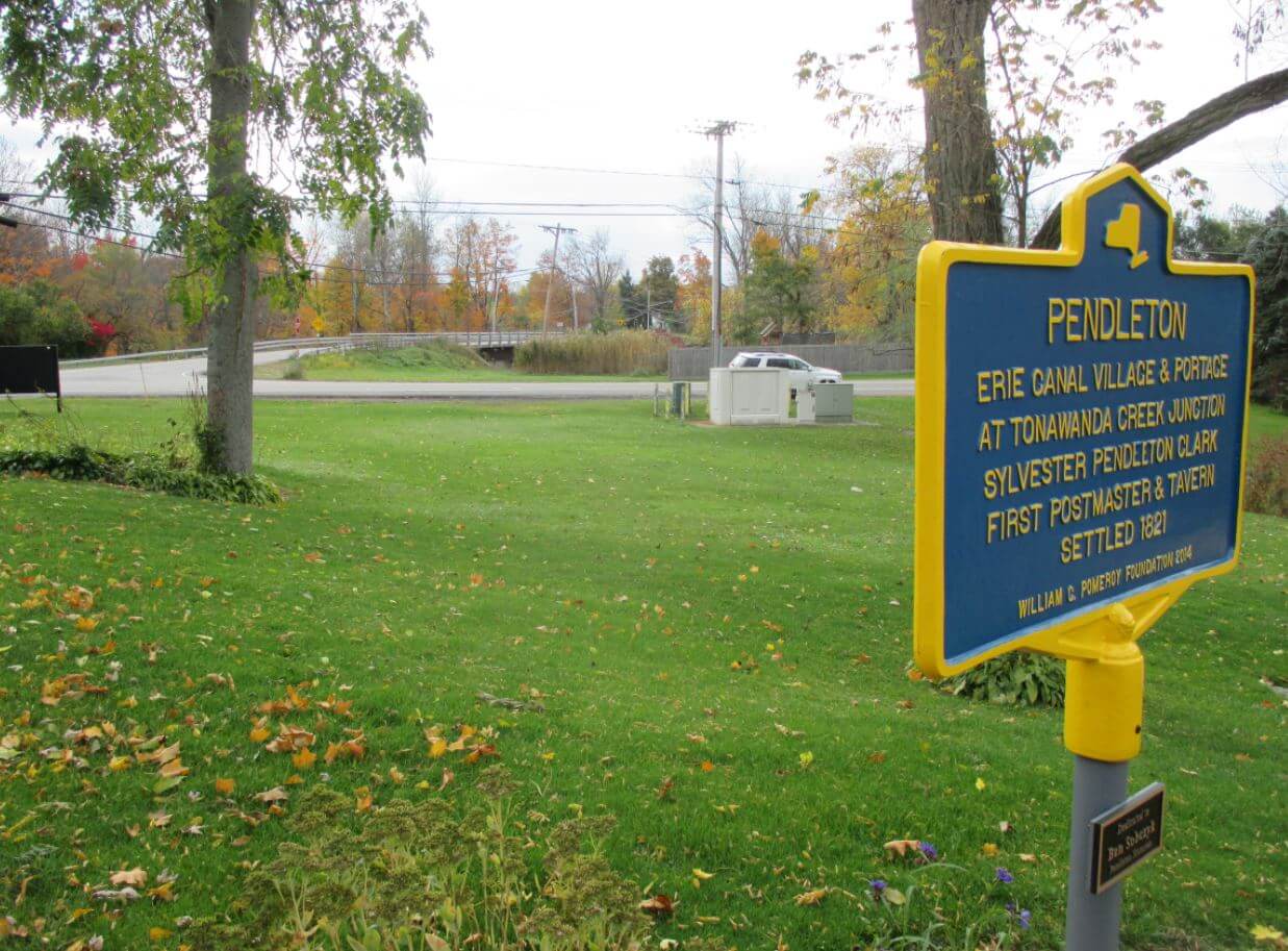 The Village of Pendleton was established in 1821 with the construction of a log tavern by Sylvester Pendleton Clark. The post office was built in 1823 and Clark was appointed postmaster. Business soon followed and the Town of Pendleton was created by the New York Legislation in 1827, receiving its name from Pendleton village.