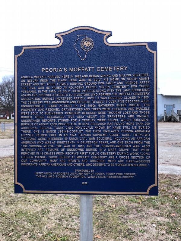 PEORIA'S MOFFATT CEMETERYAQUILLA MOFFATT ARRIVED HERE IN 1822 AND BEGAN MINING AND MILLING VENTURES. ON RETURN FROM THE BLACK HAWK WAR, HE BUILT HIS HOME ON SOUTH ADAMS STREET AND SET ASIDE A SMALL BURYING GROUND FOR FAMILY AND FRIENDS. AFTER THE CIVIL WAR HE NAMED AN ADJACENT PARCEL ‘UNION CEMETERY” FOR THOSE VETERANS. IN THE 1870S HE SOLD THESE PARCELS ALONG WITH LAND BORDERING ADAMS AND GRISWOLD STREETS TO INVESTORS WHO FORMED THE MOFFATT CEMETERY ASSOCIATION. BURIALS INCREASED RAPIDLY UNTIL IT WAS ORDERED CLOSED IN 1905. THE CEMETERY WAS ABANDONED AND EFFORTS TO SAVE IT OVER FIVE DECADES WERE UNSUCCESSFUL. COURT ACTIONS IN THE 1950S GATHERED SHARE RIGHTS, THE PROPERTY WAS REZONED, GRAVESTONES AND TREES WERE CLEARED, AND PARCELS WERE SOLD TO BUSINESSES. CEMETERY RECORDS WERE THOUGHT LOST AND THOSE BURIED THERE RELOCATED, BUT ONLY ABOUT 100 TRANSFERS ARE KNOWN. UNDERTAKER REPORTS STORED FOR A CENTURY WERE FOUND, WHICH DOCUMENT BURIALS OF ABOUT 2,500 INDIVIDUALS. RECENT RESEARCH HAS FOUND MORE THAN 200 ADDITIONAL BURIALS. TODAY, 2,600 INDIVIDUALS KNOWN BY NAME STILL LIE BURIED THERE. ONE IS NANCE LEGINS-COSTLEY, THE FIRST ENSLAVED PERSON ABRAHAM LINCOLN HELPED FREE IN AN 1841 ILLINOIS SUPREME COURT CASE. FIFTY-TWO VETERANS WERE INTERRED: 49 UNION CIVIL WAR SOLDIERS, INCLUDING AN AFRICAN AMERICAN WHO WAS AT JUNETEENTH IN GALVESTON TEXAS, AND ONE EACH FROM THE 1792 VIRGINIA MILITIA, THE WAR OF 1812, AND THE SPANISH-AMERICAN WAR. ALSO INTERRED ARE THE REMAINS OF UNKNOWNS BURIED IN A MASS GRAVE WHEN REMOVED IN 46 CRATES FROM PEORIA’S FIRST PUBLIC CEMETERY DURING WORK ALONG LINCOLN AVENUE. THOSE BURIED AT MOFFATT CEMETERY ARE A CROSS SECTION OF OUR COMMUNITY. MANY ARE INFANTS AND CHILDREN, MOST ARE HARD-WORKING IMMIGRANTS, AFRICAN AMERICANS AND OTHERS, WHO DESERVE TO BE “FORGOTTEN NO MORE.