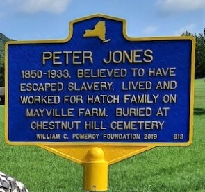 Peter Jones was born in North Carolina. He was believed to have been a slave who escaped during the Civil War with the Union army. This area of western New York was a common path for the formally enslaved escaping to freedom. While many moved further north to settle, Peter Jones lived out his life as a freed man in the Portville area. He was taken in by the Hatch family who farmed in Mayville. Affectionately known by the family as “Uncle Pete”, he lived with the Hatches until his death in 1933. He was buried in their family plot in Chestnut Hill Cemetery.