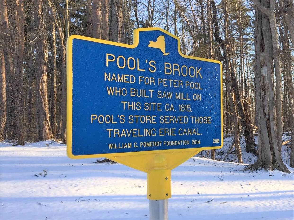 Poolsbrook (or Pool’s Brook) was named for Peter Pool, who built a saw mill at this site around 1815. Pool also had a store that served people traveling the Erie Canal. While both the saw mill and store are gone, this area still bears the name from this bygone era.