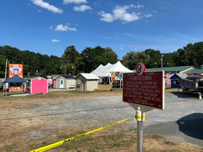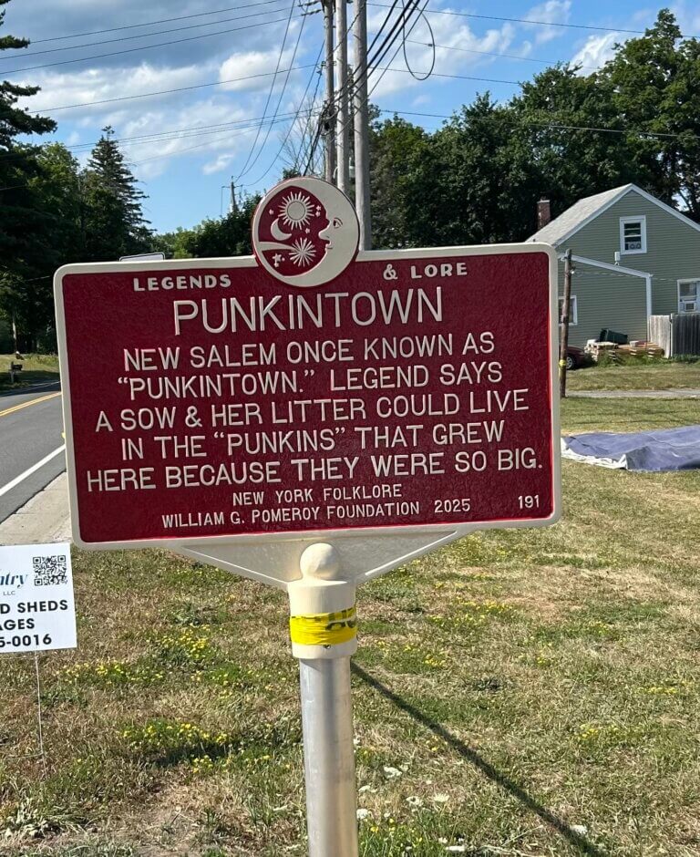 This marker celebrates a place name in Albany County which is no longer use, but which is memorialized in a festival and oral history. New Salem was originally called Punkintown, a name which originated from a legend. According to the story, a sow and her litter were able to live inside a “punkin,” because the “punkins” grown here were so large.