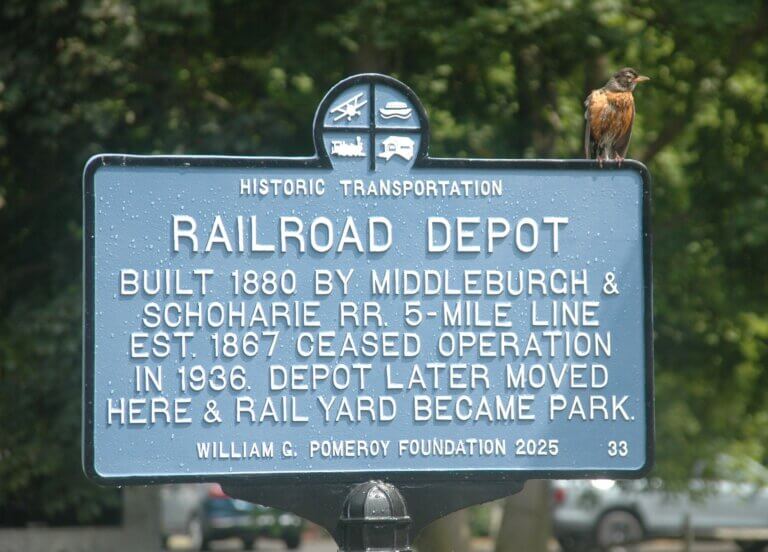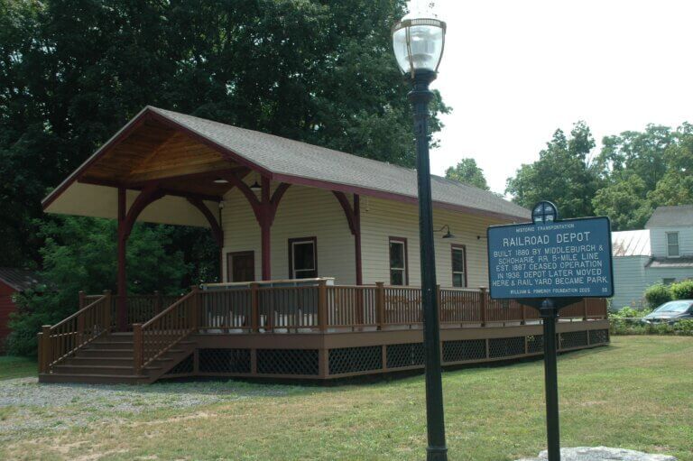 After this, the tracks were sold for scrap and the New York Power and Light Corporation purchased the railroad right of way in 1938. The former rail yard property was deeded by the New York Power and Light Corporation to the village of Middleburgh for the specific purpose of being used as a park and free public parking. The depot building located on the former rail yard property was purchased by a separate party in 1938, under the condition that it would be removed from the property within 60 days of purchase. The depot was relocated across the street and for a period was used as a private home. The former rail yard property was made into a park by the village. Eventually the depot was acquired by the village as well and now serves as a treasured historical structure that is used to bring greater recognition to the significance and impact of the Middleburgh & Schoharie Railroad in the history of this community.