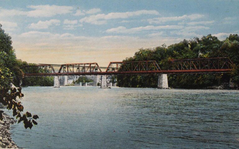 The railway began at “Boompies Hook”, also called Catskill Point, on the docks of the Hudson River at the mouth of Catskill Creek. The route then followed the creek before crossing it at the first iron bridge. It then passed under the West Shore Railroad line, which ran from north to south, before crossing the Catskill Creek twice more on the other two bridges which were constructed. (Detail from Map 26, 1891) From the Creek the trestle of the West Shore Railroad was visible behind the first CMRY Bridge. (Postcard, 1910)