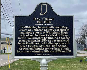 Trailblazing basketball coach Ray Crowe of Johnson County excelled at multiple sports at Whiteland High School and Indiana Central College in the 1930s before beginning a career in education. In 1950, he became head basketball coach at Indianapolis’s all-Black Crispus Attucks High School. Crowe led Attucks to the state finals four times, winning titles in 1955 and ’56.