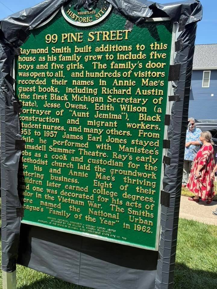 Raymond Smith built additions to this house as his family grew to include five boys and five girls. The family’s door was open to all, and hundreds of visitors recorded their names in Annie Mae’s guest books, including Richard Austin (the first Black Michigan Secretary of State), Jesse Owens, Edith Wilson (a portrayer of “Aunt Jemima”), Black construction and migrant workers, student nurses, and many others. From 1953 to 1957 James Earl Jones stayed while he performed with Manistee’ s Ramsdell Summer Theatre. Ray’s early jobs as a cook and custodian for the Methodist church laid the groundwork for his and Annie Mae’s thriving catering business. Eight of their children later earned college degrees, and one was decorated for his acts of valor in the Vietnam War. The Smiths were named the National Urban League’s “Family of the Year” in 1962.