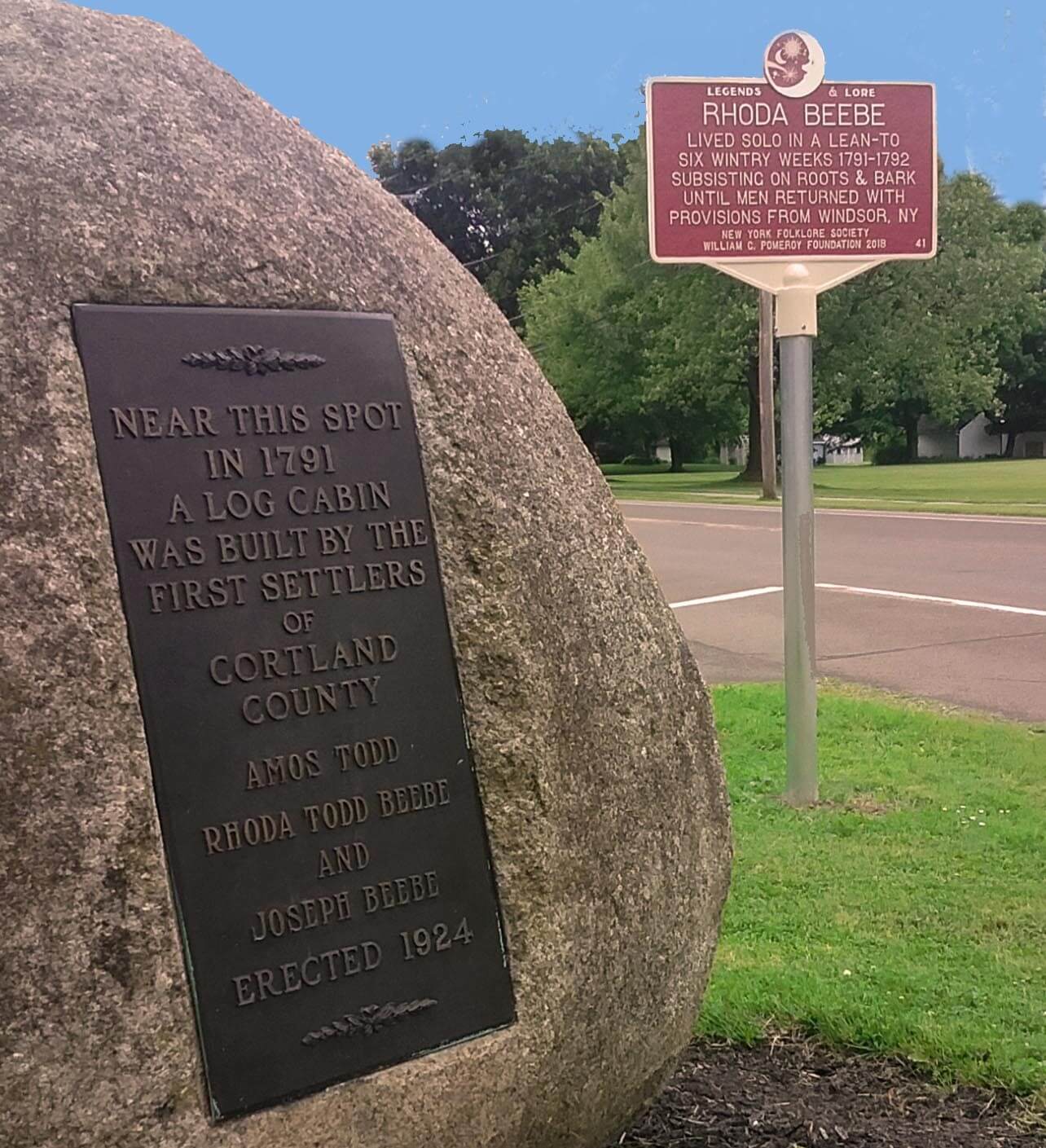 Rhoda Beebe, her brother Amos Todd, and her husband Joseph Beebe traveled from New Haven, Connecticut, and set up a temporary shelter on the banks of the Tioughnioga River in what would become the Town of Homer in Central New York. Rhoda was left alone in nothing more than a pole lean-to/cabin with a blanket for a door while her husband and brother spent three days rounding up strayed horses. She was said to have endured the long and lonely hours and was able to keep “a tranquil mind and received no annoyance, save such as was caused by the howling wolf and screaming panther”.