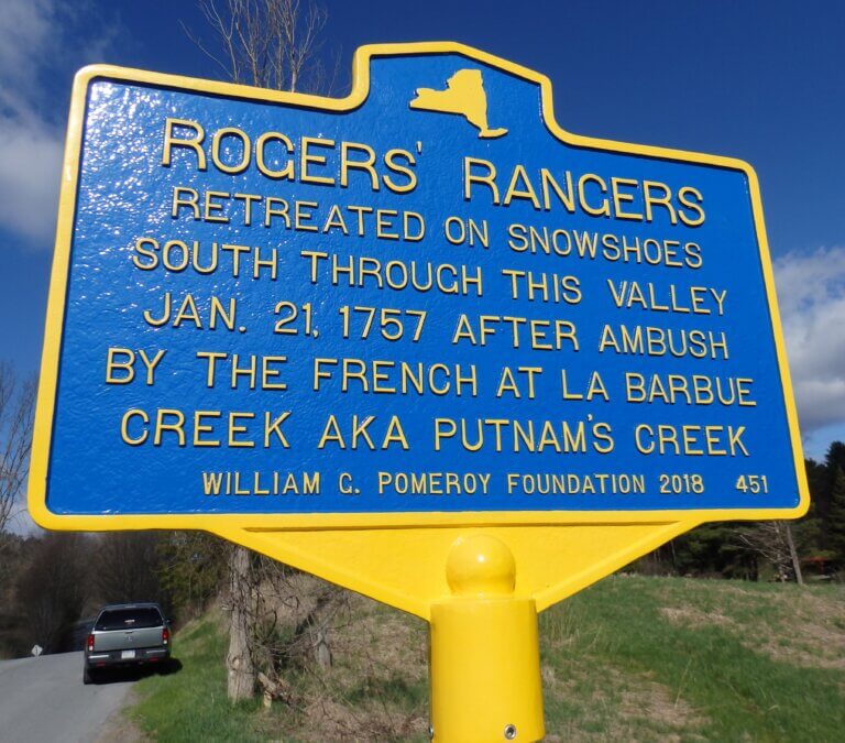 Fire from both sides ceased at night fall, and concluding that night was their best chance at escape, Rogers ordered his men to continue the retreat to Lake George. The force made it back to Fort William Henry on January 23, 1757, and as of 2019, this marker stands with another in Ticonderoga to commemorate the ambush and retreat of Rogers’ Rangers.