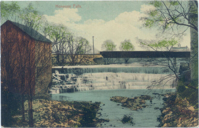 During the mid-19th century, the New York Central Railroad constructed a covered bridge across Honeoye Creek for its line connecting Canandaigua and Niagara Falls. Colloquially, the route was referred to as the “peanut” line, a reference to the first cargo supposedly shipped across it.