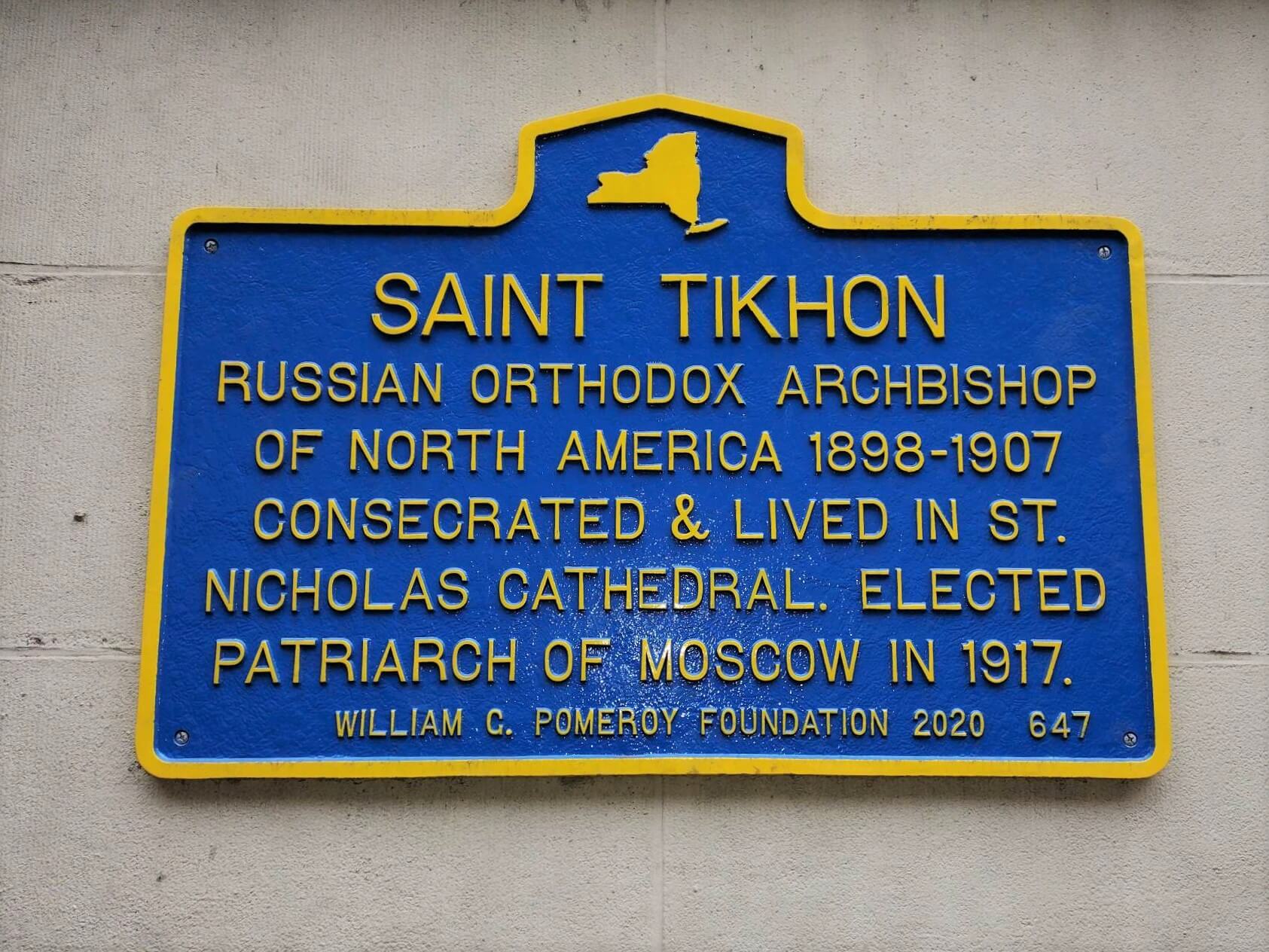 Tikhon of Moscow (1865-1925) was born in Pskov, Russia as Vasily Ivanovich Bellavin. He was educated at Petrograd Ecclesiastical Academy. When he took monastic vows in 1891, he was given the name Tikhon in honor of Saint Tikhon of Zadonsk. In 1898, he was named archbishop of North America and the Aleutian Islands for the Russian Orthodox Church and served in that capacity until 1907. On May 22, 1901, he consecrated Saint Nicholas Cathedral, the first Russian Orthodox Church in New York City, laying the cornerstone of the building at its site on Ninety-seventh Street near Fifth Avenue in Manhattan. He later moved the American headquarters of the Russian Orthodox diocese from San Francisco to New York and lived in a suite of apartments in the rectory at St. Nicholas.