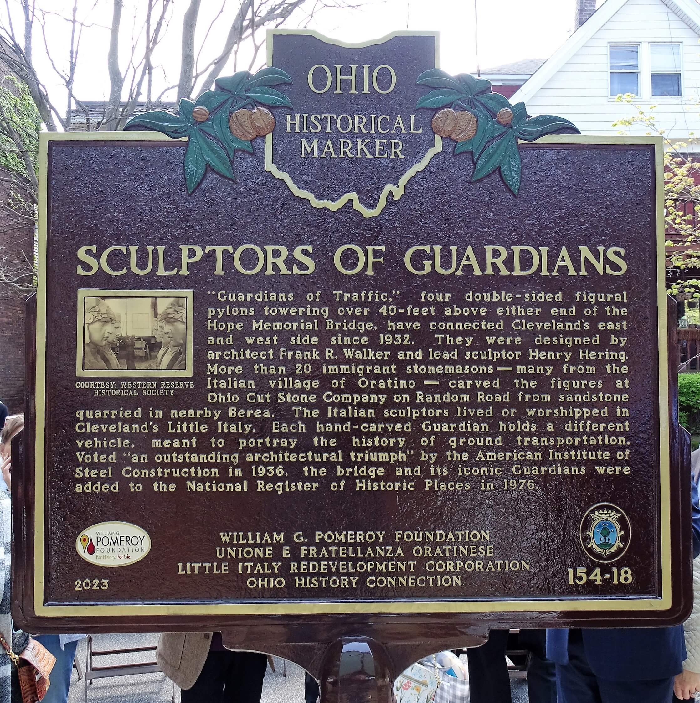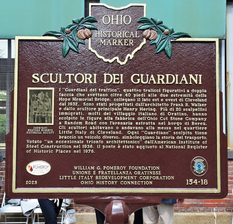 (Side B Italian inscription) I “Guardiani del traffico”, quattro tralicci figurativi a doppia faccia che svettano oltre 40 piedi alle due estremità della Hope Memorial Bridge, collegano il lato est e ovest di Cleveland dal 1932. Sono stati progettati dall’architetto Frank R. Walker e dallo scultore principale Henry Hering. Più di 20 scalpellini immigrati, molti del villaggio italiano di Oratino, hanno scolpito le figure alla fabbrica dell’Ohio Cut Stone Company a Random Road con l’arenaria estratta nel borgo di Berea. Gli scultori abitavano o andavano alla messa nel quartiere Little Italy di Cleveland. Ogni “Guardiano” scolpito tiene braccio un veicolo diverso, simboleggiano la storia del trasporto. Votato “un eccezionale trionfo architettonico” dall’American Institute of Steel Construction nel 1936, il ponte è stato aggiunto al National Register of Historic Places nel 1976.