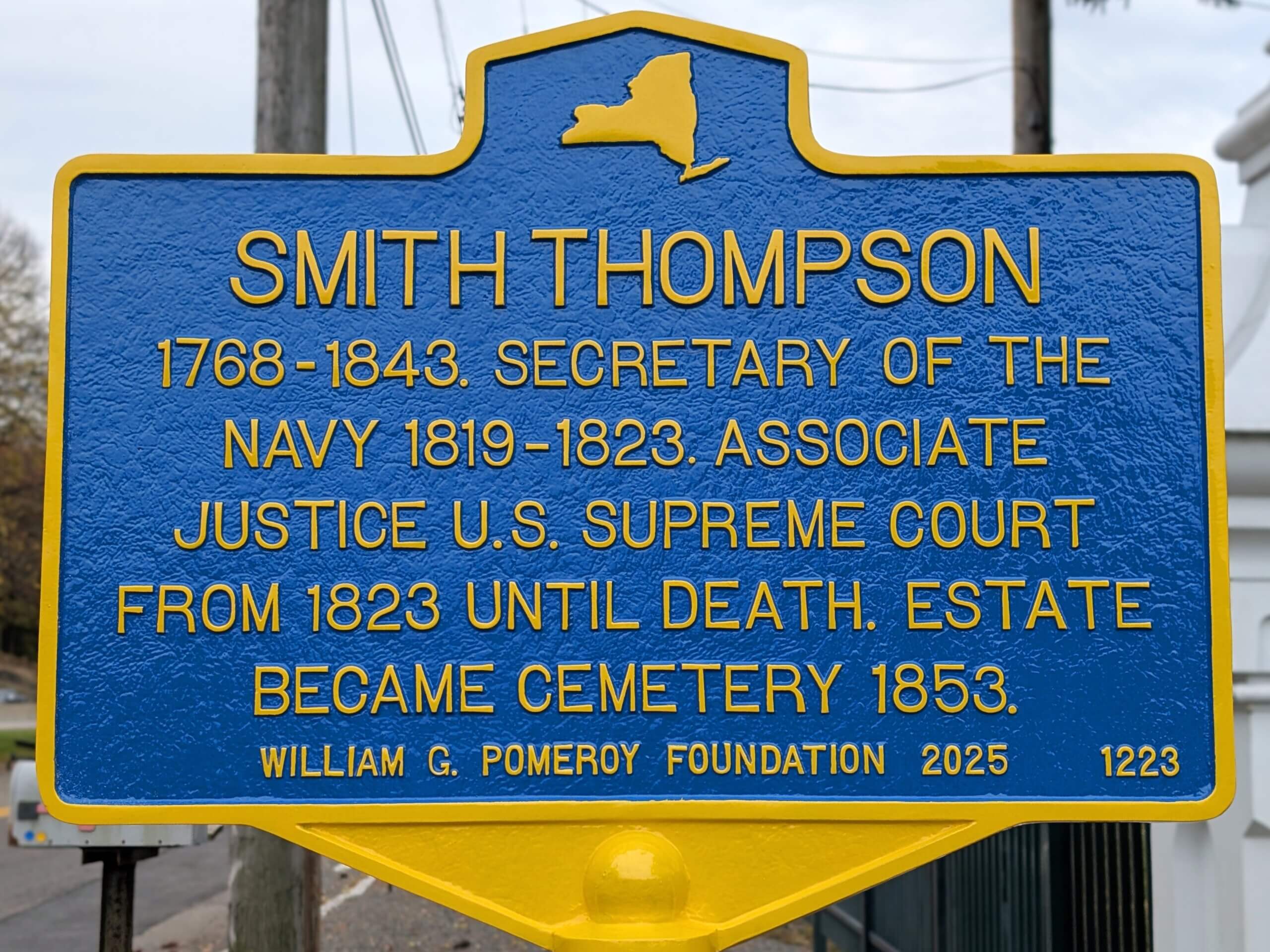 Hon. Smith Thompson was born on January 17, 1768, likely in Dutchess County. It was reported in his obituary that Thompson had studied law and then began public life as a District Attorney in 1801 for what was known at the time as the “middle district” of NY. Later in 1801 there were two vacancies on the NY State Supreme Court, and Thompson became an associate Judge. In 1804 he became the Chief Justice for the NY State Supreme Court (Brooklyn Evening Star, December 21, 1843).