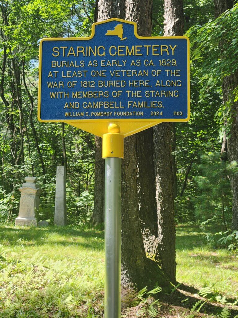 The Staring Cemetery is the final resting place of members of the Staring and Campbell families, who trace their roots back to the Mohawk Valley during the Revolutionary War and who arrived in the Martinsburg area about the 1820s. The earliest known burial in the cemetery occurred ca. 1829, and among those interred is at least one veteran from the War of 1812.