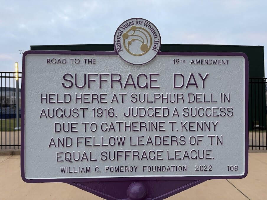 In August 1916, Suffrage Day was held during a baseball game at Sulphur Dell, a baseball park in Nashville, Tennessee that was home to the Nashville Volunteers Minor League Baseball team. The Suffrage Day festivities were organized by Tennessee suffragist Catherine T. Kenny, serving as general chair of arrangements, and fellow leaders of the Tennessee Equal Suffrage League.