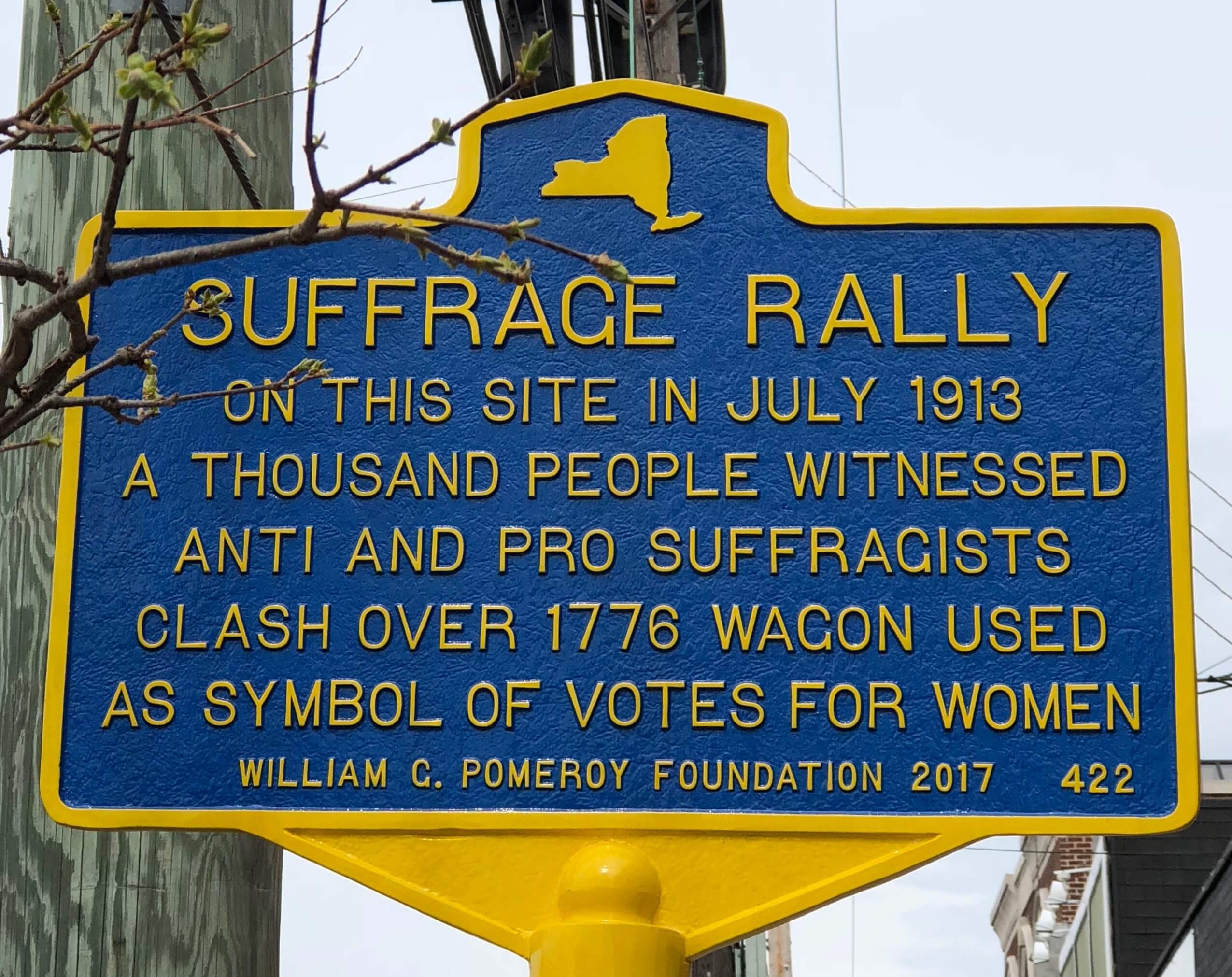 It was on this site in July of 1913 that over one thousand people witnessed both anti and pro suffragists clash over the 1776 Wagon that was used as the symbol of the Votes for Women Movement. The “Spirit of 1776” wagon, which dates to the American Revolution, was donated to the New York Woman Suffrage Association by the I.S. Remson Wagon Company of Long Island, New York.