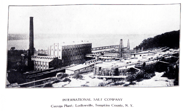 From 1891 to 1962, the Cayuga Lake Salt Company produced refined salt from brine pumped from wells drilled on the east shore of Cayuga Lake, near the mouth of Salmon Creek in the hamlet of Ludlowville, located in the town of Lansing in Tompkins County, New York. The Cayuga Lake Salt Company was incorporated in August 1891 by Royal V. Lamberson, John A. Clute, Luther B. Van Kirk, Arthur Oliver, and Warren W. Clute, all of Warsaw, New York, “to drill wells, pump brine, mine, manufacture and sell salt” (Rochester Democrat and Chronicle, August 17, 1891). The company erected a plant and warehouses on the shores of the lake, conveniently positioned for both boat and rail shipment of the salt. According to the 1894 Landmarks of Tompkins County, the company quickly grew to employ around 100 people, producing 1,000 barrels a day.