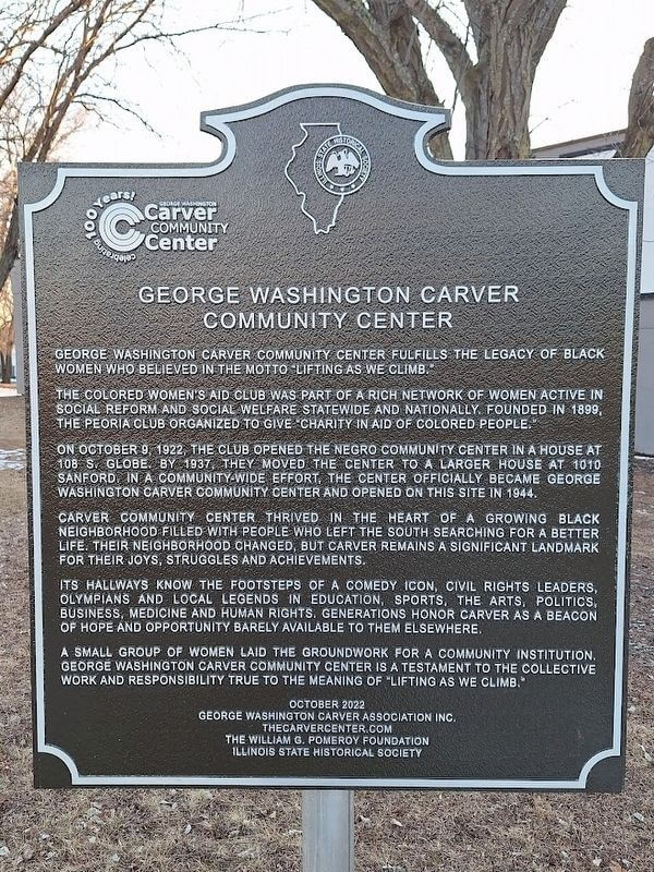 THE CARVER CENTERON OCTOBER 9, 1922, PEORIA’S COLORED WOMEN’S AID CLUB OPENED A NEGRO COMMUNITY CENTER IN PEORIA. TODAY THE GEORGE WASHINGTON CARVER COMMUNITY CENTER STANDS AS SUCCESSOR TO THE EFFORTS OF THESE WOMEN AND A FITTING LOCATION FOR A HISTORIC MARKER.
