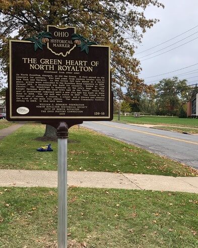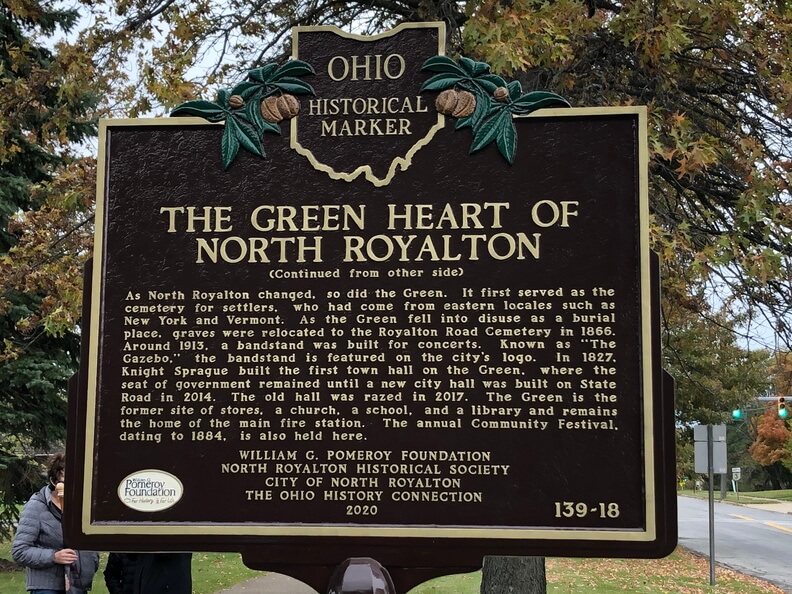 THE GREEN HEART OF NORTH ROYALTONBounded by Ridge, Royalton, and Bennett Roads, the Green has been the heart of North Royalton even before it was incorporated. Once part of Brecksville Township, Royalton became its own township in 1818. Local lore says that settlers David and Knight Sprague paid a gallon of whiskey to name the community after their hometown of Royalton, Vermont. In 1825, John Watkins sold five acres to create this Green, so that the township could have a cemetery, a public square, and a place for public buildings. In 1885, “North” was added to “Royalton” to distinguish it from another Royalton in Ohio. Formerly a small agricultural community known for milk and cheese production, as well as nurseries, North Royalton became a Cleveland suburb following World War II. North Royalton incorporated as a village in 1927 and became city in 1961. (Continued on other side)