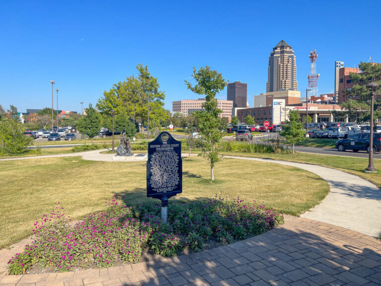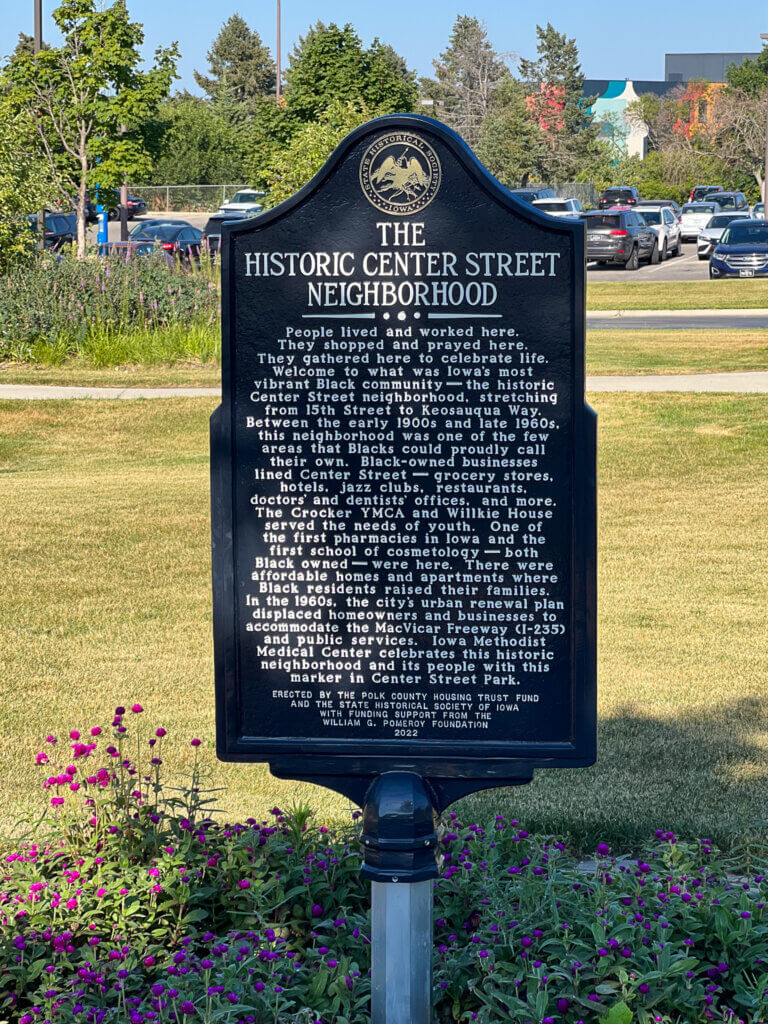 The Historic Center Street NeighborhoodPeople lived and worked here. They shopped and prayed here. They gathered here to celebrate life. Welcome to what was Iowa’s most vibrant Black community — the historic Center Street neighborhood, stretching from 15th Street to Keosauqua Way. Between the early 1900s and late 1960s, this neighborhood was one of the few areas that Blacks could proudly call their own. Black-owned businesses lined Center Street — grocery stores, hotels, jazz clubs, restaurants, doctors’ and dentists’ offices, and more. The Crocker YMCA and Willkie House served the needs of youth. One of the first pharmacies in Iowa and the first school of cosmetology — both Black owned — were here. There were affordable homes and apartments where Black residents raised their families. In the 1960s, the city’s urban renewal plan displaced homeowners and businesses to accommodate the MacVicar Freeway (I-235) and public services. Iowa Methodist Medical Center celebrates this historic neighborhood and its people with this marker in Center Street Park.