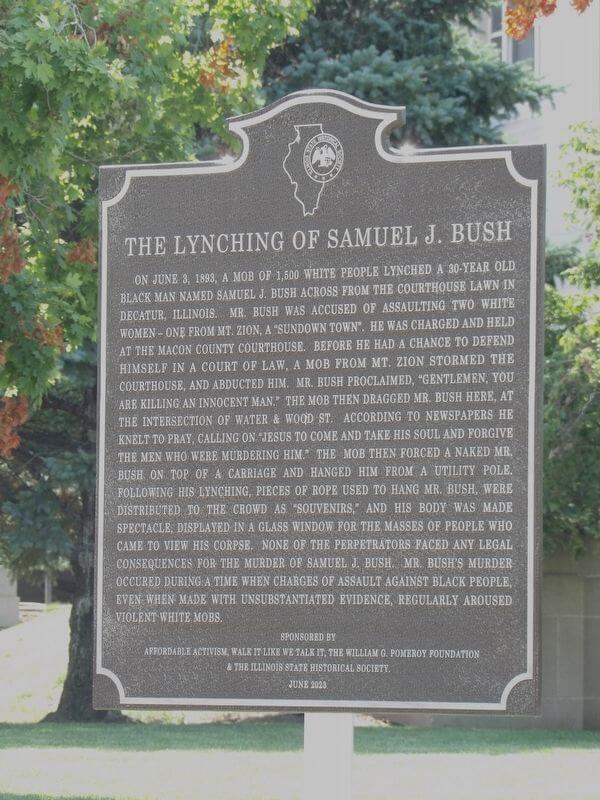 THE LYNCHING OF SAMUEL J. BUSHON JUNE 3, 1893, A MOB OF 1,500 WHITE PEOPLE LYNCHED A 30-YEAR-OLD BLACK MAN NAMED SAMUEL J, BUSH ACROSS FROM THE COURTHOUSE LAWN IN DECATUR, ILLINOIS, MR, BUSH WAS ACCUSED OF ASSAULTING TWO WHITE WOMEN – ONE FROM MT, ZION, A “SUNDOWN TOWN”. HE WAS CHARGED AND HELD AT THE MACON COUNTY COURTHOUSE. BEFORE HE HAD A CHANCE TO DEFEND HIMSELF IN A COURT OF LAW, A MOB FROM MT. ZION STORMED THE COURTHOUSE, AND ABDUCTED HIM. MR. BUSH PROCLAIMED, “GENTLEMEN, YOU ARE KILLING AN INNOCENT MAN.” THE MOB THEN DRAGGED MR. BUSH HERE, AT THE INTERSECTION OF WATER & WOOD ST. ACCORDING TO NEWSPAPER ACCOUNTS HE KNELT TO PRAY, CALLING ON “JESUS TO COME AND TAKE HIS SOUL AND FORGIVE THE MEN WHO WERE MURDERING HIM.” THE MOB THEN FORCED A NAKED MR. BUSH ON TOP OF A CARRIAGE AND HANGED HIM FROM A UTILITY POLE. FOLLOWING HIS LYNCHING, PIECES OF ROPE USED TO HANG MR. BUSH, WERE DISTRIBUTED TO THE CROWD AS “SOUVENIRS,” AND HIS BODY WAS MADE SPECTACLE, DISPLAYED IN A GLASS WINDOW FOR THE MASSES OF PEOPLE WHO CAME TO VIEW HIS CORPSE. NONE OF THE PERPETRATORS FACED ANY LEGAL CONSEQUENCES FOR THE MURDER OF SAMUEL J. BUSH. MR. BUSH’S MURDER OCCURRED DURING A TIME WHEN CHARGES OF ASSAULT AGAINST BLACK PEOPLE, EVEN WHEN MADE WITH UNSUBSTANTIATED EVIDENCE, REGULARLY AROUSED VIOLENT WHITE MOBS.
