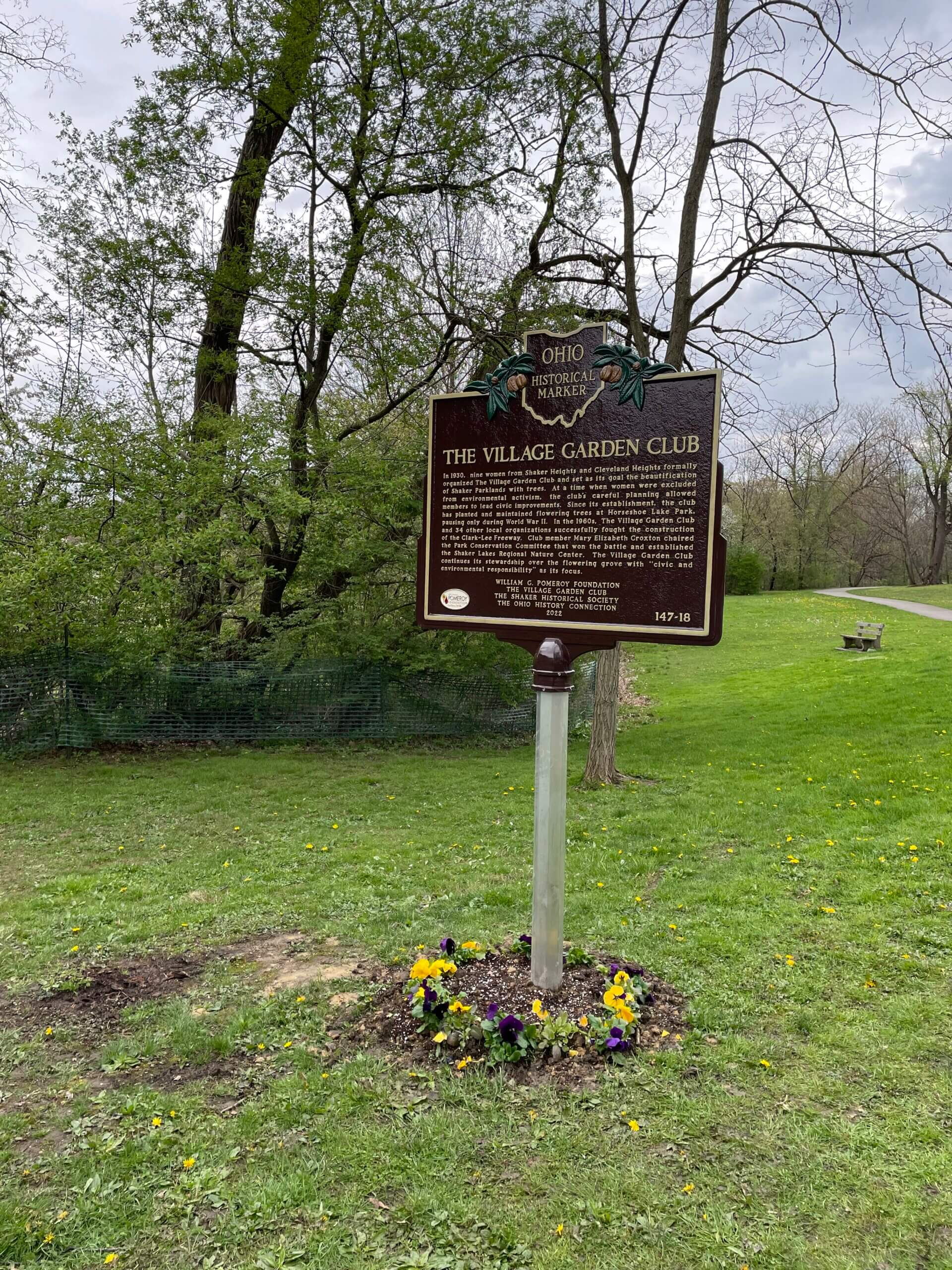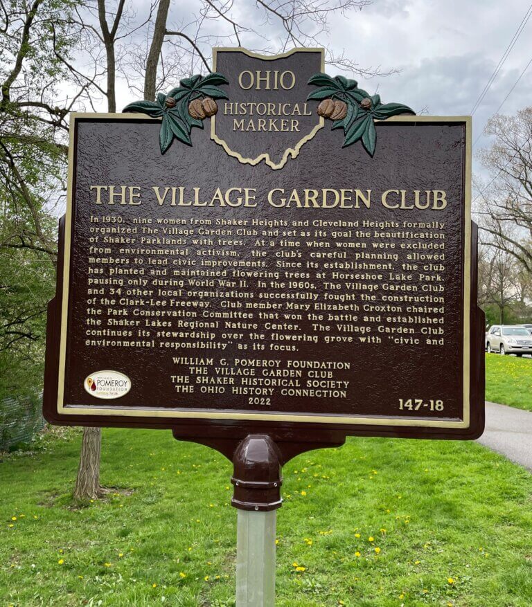THE VILLAGE GARDEN CLUBIn 1930, nine women from Shaker Heights and Cleveland Heights formally organized The Village Garden Club and set as its goal the beautification of Shaker Parklands with trees. At a time when women were excluded from environmental activism, the club’s careful planning allowed members to lead civic improvements. Since its establishment, the club has planted and maintained flowering trees at Horseshoe Lake Park, pausing only during World War II. In the 1960s, The Village Garden Club and 34 other local organizations successfully fought the construction of the Clark-Lee Freeway. Club member Mary Elizabeth Croxton chaired the Park Conservation Committee that won the battle and established the Shaker Lakes Regional Nature Center. The Village Garden Club continues its stewardship over the flowering grove with “civic and environmental responsibility” as its focus.