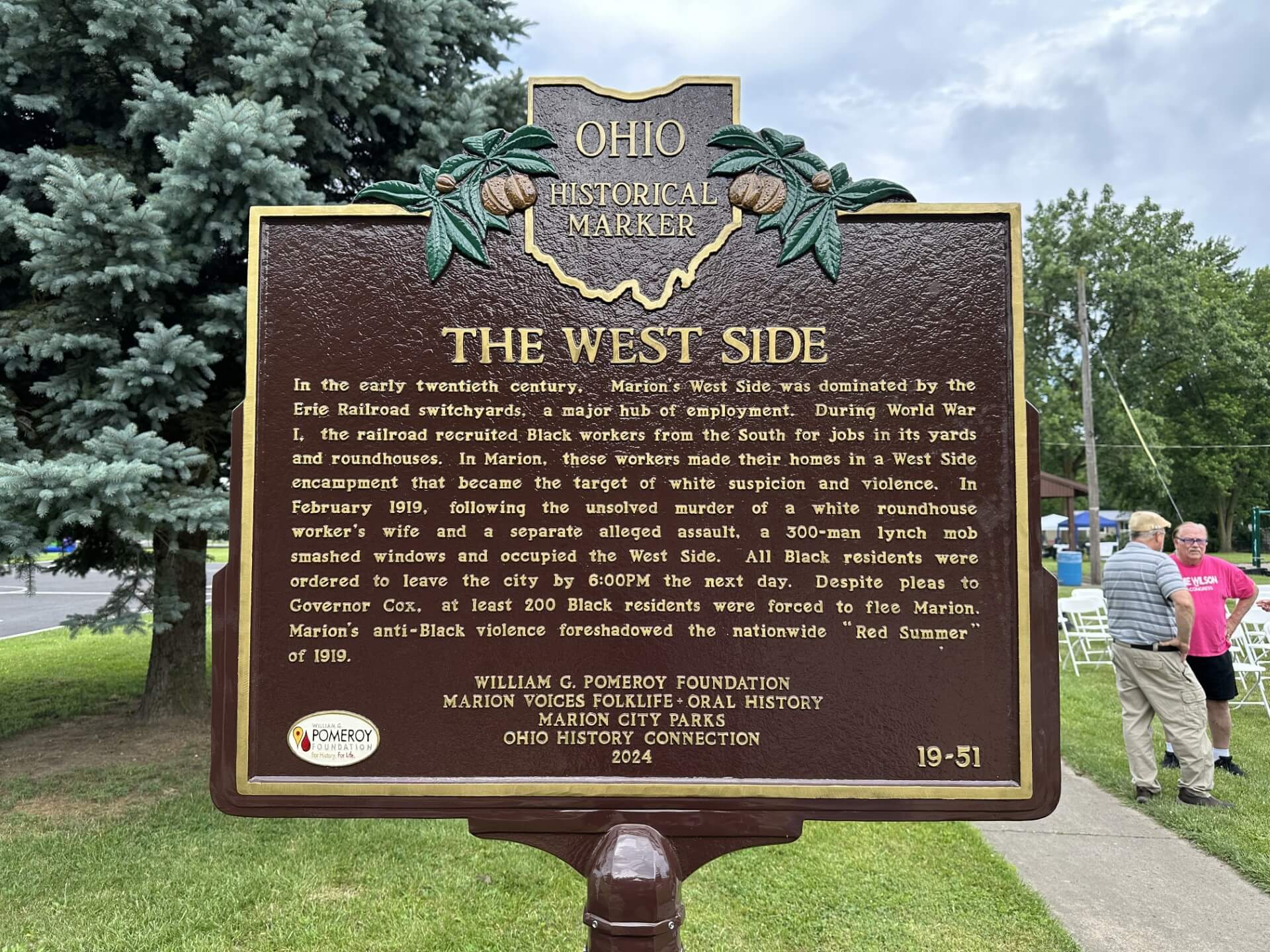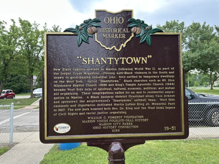 (Side B) New Black families arrived in Marion following World War II, as part of the longer Great Migration. Fleeing anti-Black violence in the South and drawn to good-paying industrial jobs, they settled in temporary dwellings on the West Side, called “Shantytown.” Black churches such as Mt. Zion Missionary Baptist Church (1919) and King’s Temple Apostolic Church (1944) became West Side hubs of spiritual, cultural, economic, political, and mutual aid organizing. These congregations called for an end to residential segregation in Marion. A Black business district flourished along Cass Avenue and sponsored the neighborhood’s “Shantytown” softball team. West Side residents and dignitaries dedicated Martin Luther King Jr. Memorial Park in 1987. The new park honored both Rev. Dr. King and the West Side’s legacy of Civil Rights and racial justice organizing.