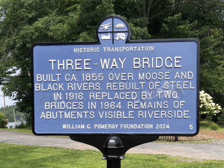 The bridge became known locally as “White Bridge” due to its high, wooden walls, which would eventually be removed around 1906. With the advent of the automobile during the early 20th century and subsequent increased traffic, the older, wooden three-way bridge became unsafe for travel. In 1916, work began on a replacement three-way bridge made of a steel truss structure. By the end of September 1916, the abutments of the new bridge were close to completion and the steel trusses over the Moose River span were nearly erected. By mid-December 1916, the new steel bridge was open to traffic.