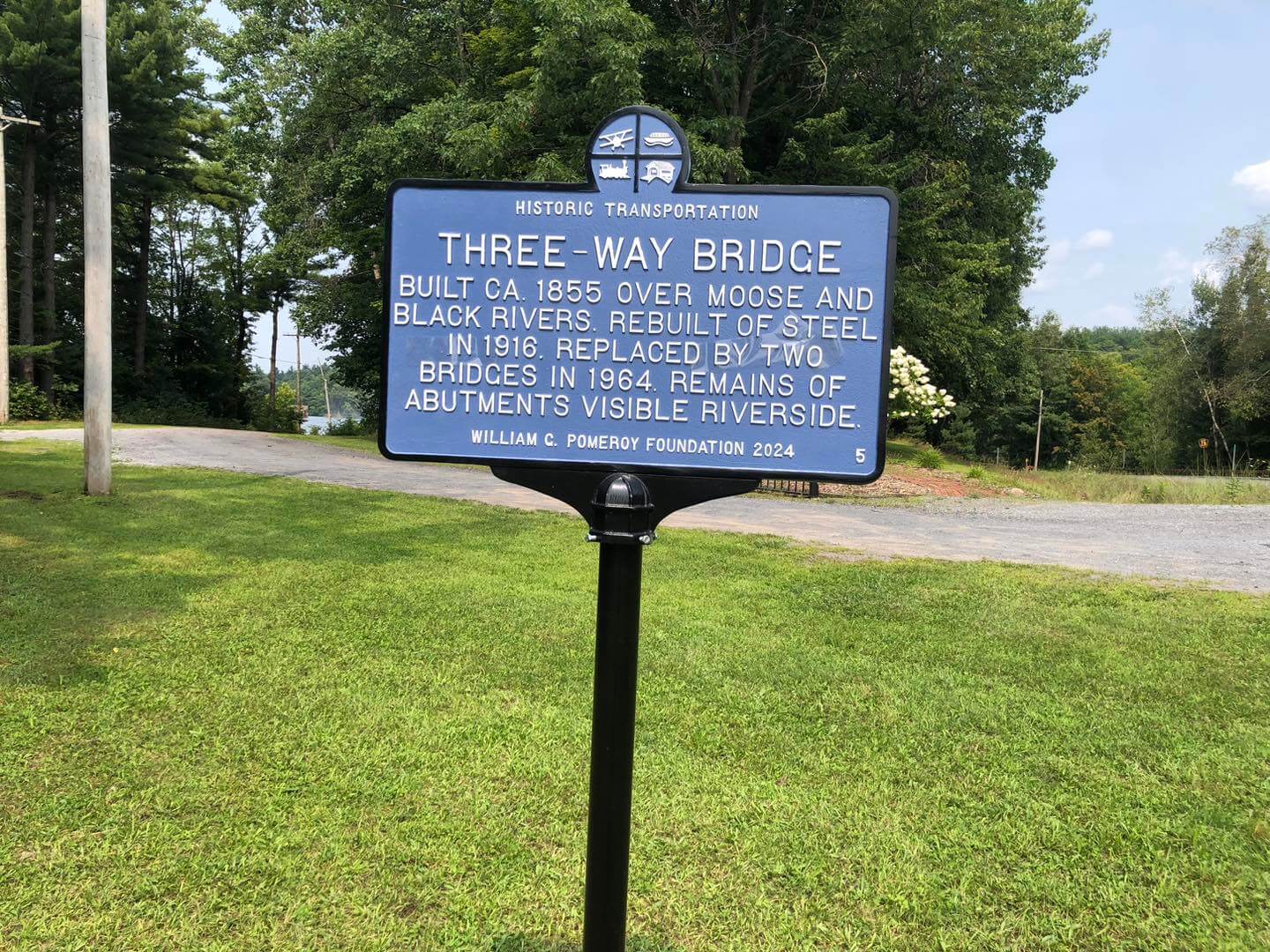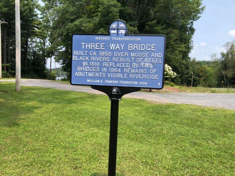 Around 1855, a three-way bridge was constructed spanning the Moose and Black Rivers in Lyons Falls in Lewis County, New York. According to an 1854 report of the State Engineer and Surveyor on the Canals of the State of New York, work on the bridge was put under contract during that year as part of the Black River Canal, a 35-mile canal between Rome and Lyons Falls that opened in 1850. Nearly completed by the end 1854, the new three-way bridge at the terminus of the canal in Lyons Falls was projected to be completed by July 1855. Once completed, it provided a vital connection for the surrounding communities for many years.