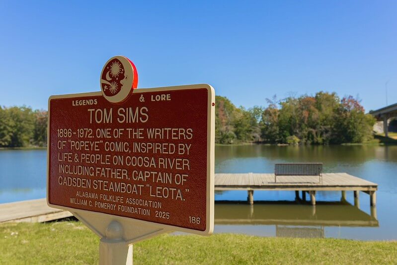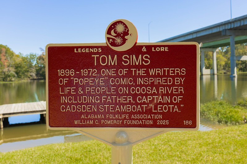 The Coosa River, an approximately 280-mile tributary of the Alabama River that winds through the states of Alabama and Georgia, served as a source of inspiration for Tom Sims (1896-1972), a writer for the Popeye comic strip. Born on the banks of the Coosa River, Sims took over writing the stories for Popeye after the original creator’s death in 1938 and wrote for the comic until 1954. In an interview published in 1944 in The Coosa River Valley by Hughes Reynolds, Sims recalled: