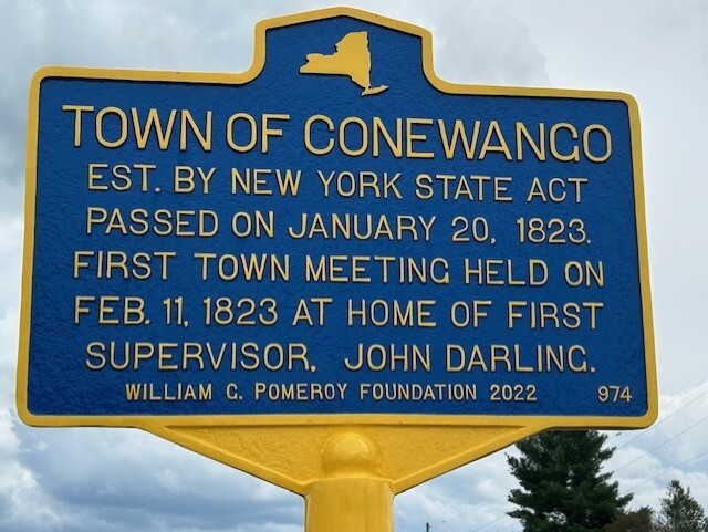 The first town meeting for the newly established Conewango was held on February 11, 1823 at the home of John Darling (1786-1867), a local farmer and land owner. According to the 1879 History of Cattaraugus Co. by L.H. Everts, Darling had settled in the area on lot 38 in 1821, having relocated from Vermont. At the first town meeting in 1823, Darling was elected the first supervisor of the town. A number of other town officials were elected at the meeting as well, including town clerk, assessor, collector, poormasters, highway commissioners, school commissioners, school inspectors, and constables.