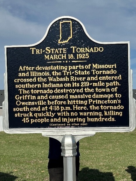 After devastating parts of Missouri and Illinois, the Tri-State Tornado crossed the Wabash River and entered southern Indiana on its 219-mile path. The tornado destroyed the town of Griffin and caused massive damage to Owensville before hitting Princeton’s south end at 4:18 p.m. Here, the tornado struck quickly with no warning, killing 45 people and injuring hundreds.