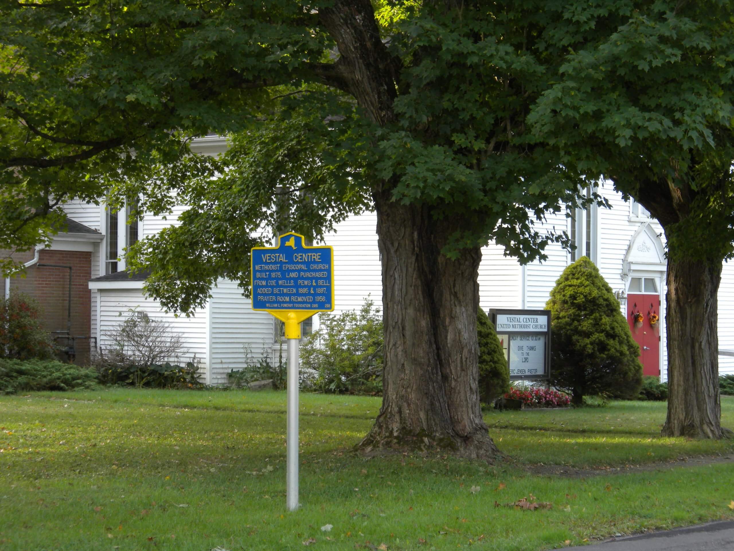 Vestal Centre Methodist Episcopal Church, located in the Hamlet of Vestal Centre, was built in 1875 on land purchased from Coe Wells. Church bell and pews were added in the late 1890s, and in 1956 the prayer room was removed. Vestal Centre M.E. Church has served as a place of worship, for many years.