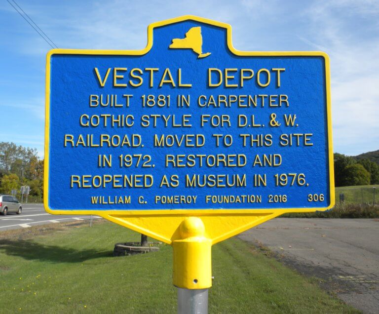 Historically railroads were important to development of communities and the Vestal Depot is no exception. This depot, built 1881, in the Carpenter Gothic Style for the Delaware, Lackawanna & Western Railroad Company, remained in operation for several years. Threatened with demolition, the Vestal Depot was moved in 1972 and was later restored and reopened as a museum in 1976.
