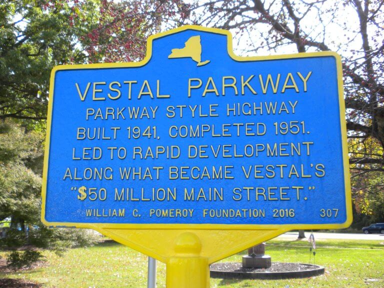 The Vestal Parkway, built in 1941 and completed in 1951, resulted in the rapid growth of businesses in the community of Vestal giving it the nickname “$50-Million Dollar Main Street.” This historic marker was part of a special theme called the “Booming 1950s.”