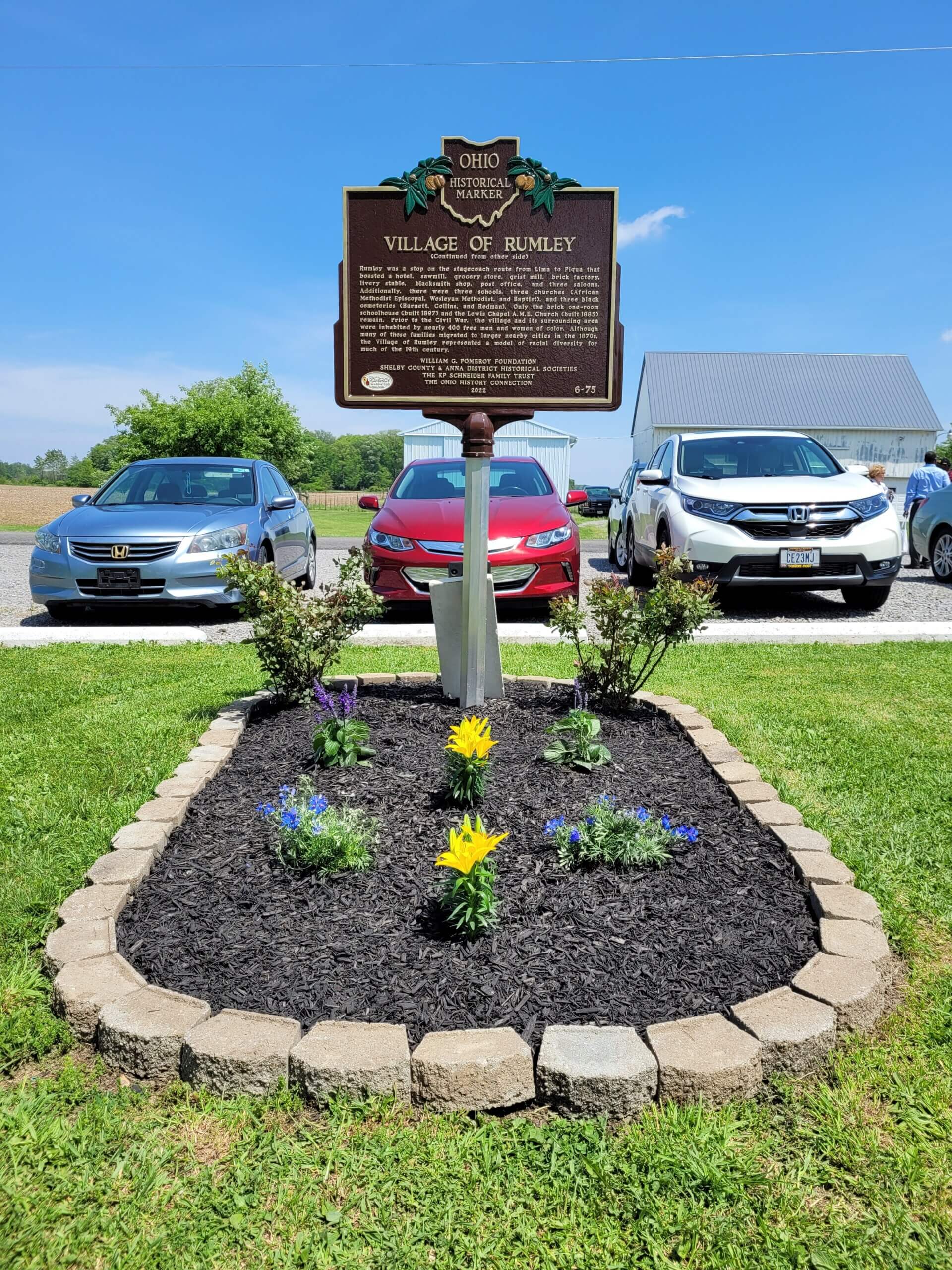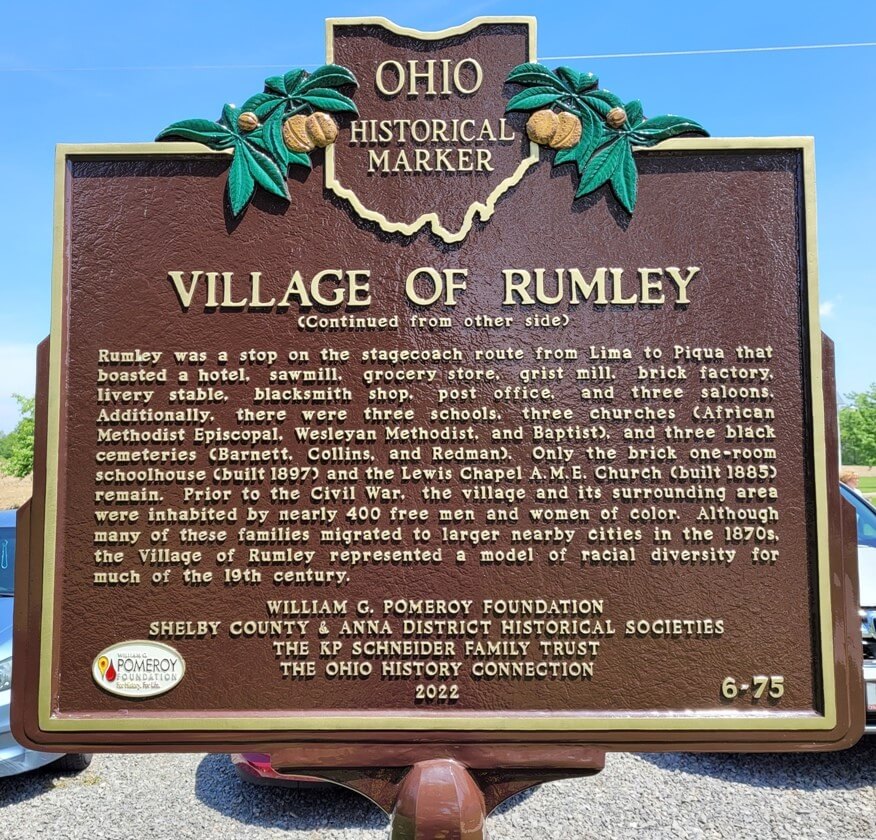 (Continued from other side) Rumley was a stop on the stagecoach route from Lima to Piqua that boasted a hotel, sawmill, grocery store, grist mill, brick factory, livery stable, blacksmith shop, post office, and three saloons. Additionally, there were three schools, three churches (African Methodist Episcopal, Wesleyan Methodist, and Baptist), and three black cemeteries (Barnett, Collins, and Redman). Only the brick one-room schoolhouse (built 1897) and the Lewis Chapel A.M.E. Church (built 1885) remain. Prior to the Civil War, the village and its surrounding area were inhabited by nearly 400 free men and women of color. Although many of these families migrated to larger nearby cities in the 1870s, the Village of Rumley represented a model of racial diversity for much of the 19th century.