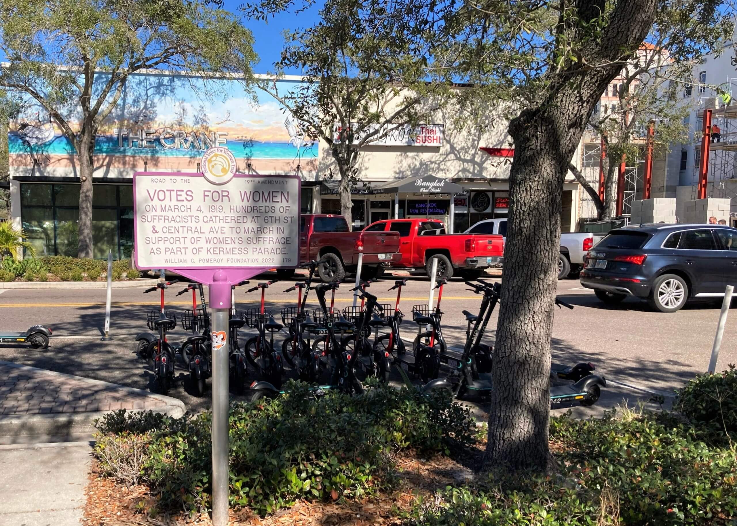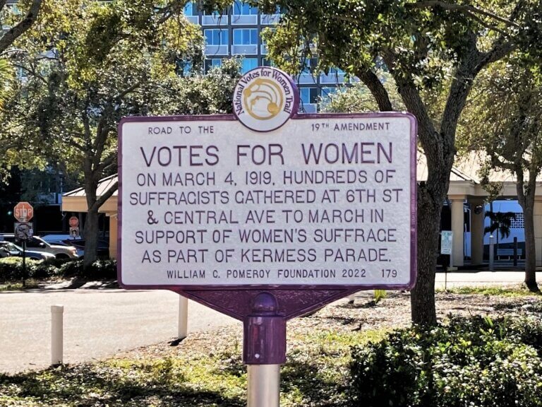 On March 4, 1919, suffragists gathered at Sixth Street and Central Avenue in the city of St. Petersburg in Pinellas County, Florida to march in support of women’s right to vote. The suffrage marchers made up the women’s suffrage section of the Kermess Parade. That day’s edition of the Tampa Bay Times projected that thousands of people were to take part in the Kermess Parade that evening. The March 5 edition of the Tampa Bay Times put the number of marchers in the women’s suffrage section of the parade around 350, with suffragists representing 25 different states, along with Canada, New Zealand, and England. It was reported that the suffrage marchers were under the direction of the suffrage department of the Pinellas County Federation of Women’s Clubs. The Tampa Bay Times provided a description of the women’s suffrage section: