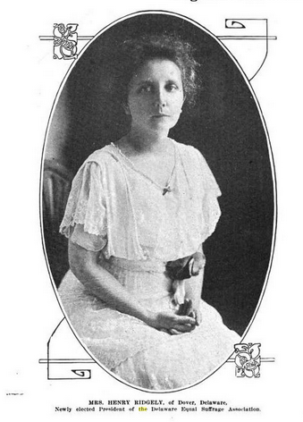 Mrs. Henry Ridgely, President of the Delaware Equal Suffrage Association, said last night in discussing the coming session of the Legislature, with reference to its probable action on the Susan B. Anthony amendment: “Suffrage is an assured fact. No action of the Delaware legislature can delay it more than for a brief season. People of the original thirteen colonies were committed to the cause of independence; so the people of America are today committed to the ballot for their women. Delaware was loyal to America in 1776. She will be loyal to America in 1920. She will prove her loyalty by her action in the historic statehouse at Dover, whose walls witnessed the birth of the first state of the union, and will witness the birth of justice to the daughters of the Union.”