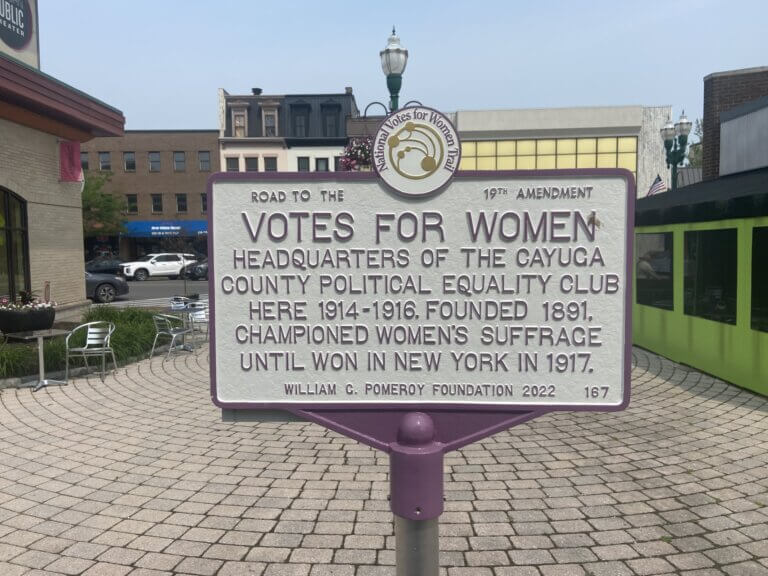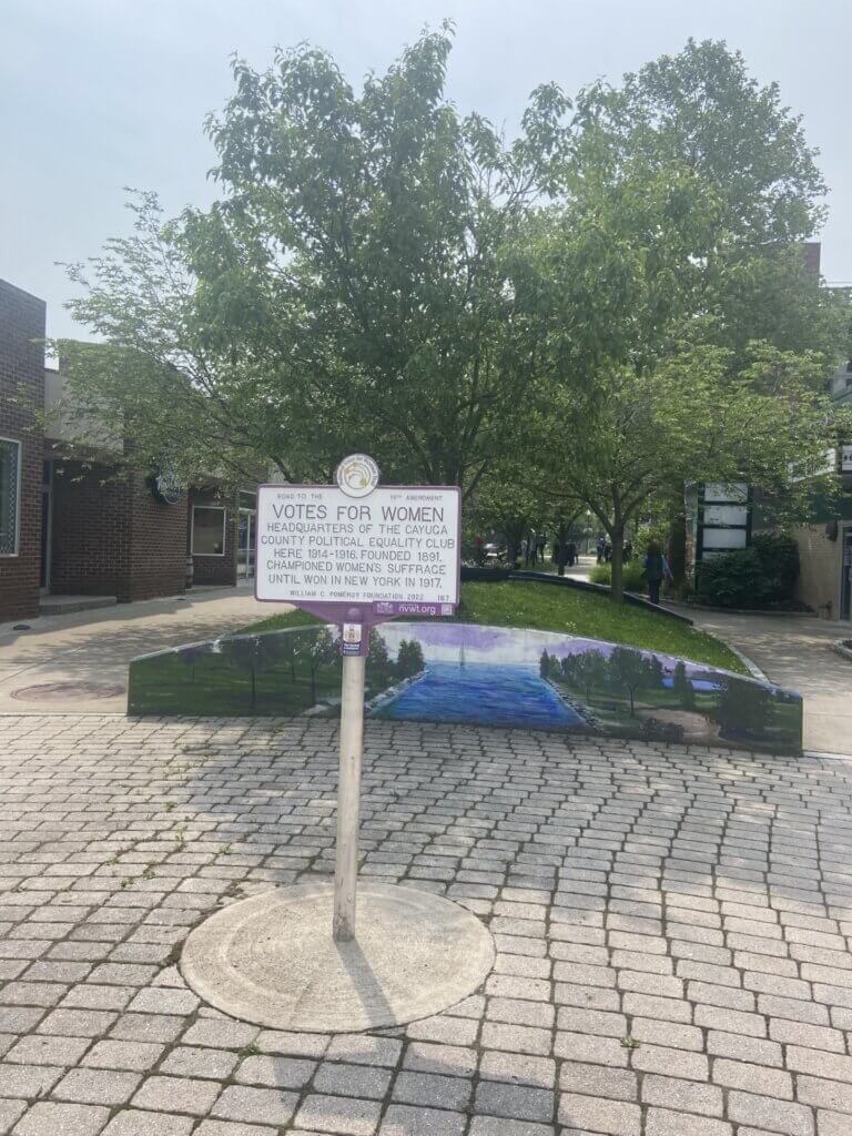 From 1914-1916 the Headquarters of the Cayuga County PEC operated at the location where this historic marker sits. Located in the heart of downtown Auburn, windows were plastered with pro-women’s suffrage literature meant to draw attention to those passing by. Nearby, the aforementioned WEIU was within walking distance–just a quick stroll down Exchange Street–which provided working class women with educational opportunities and resources as Auburn grew as an industrial and manufacturing hub. Many of the women who benefitted from the WEIU offerings went on to participate in the women’s suffrage movement, and the two organizations created a pipeline of community activists that helped lead the charge in Cayuga County.