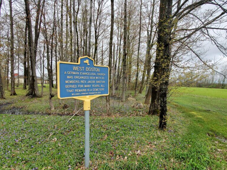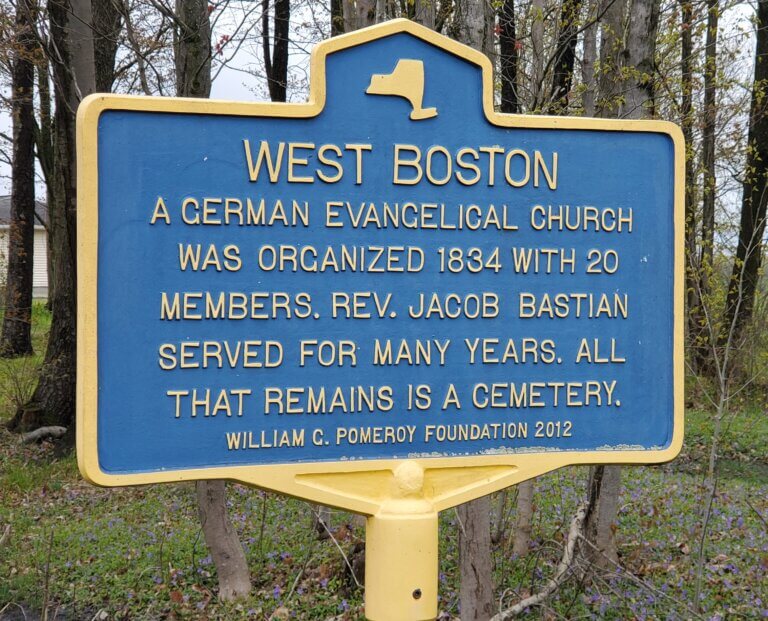 A German Evangelical church was organized in Boston, NY, around 1834. The congregation was comprised of nearly 20 members and The Rev. Jacob Bastian served for many years. All that remains today is a cemetery.