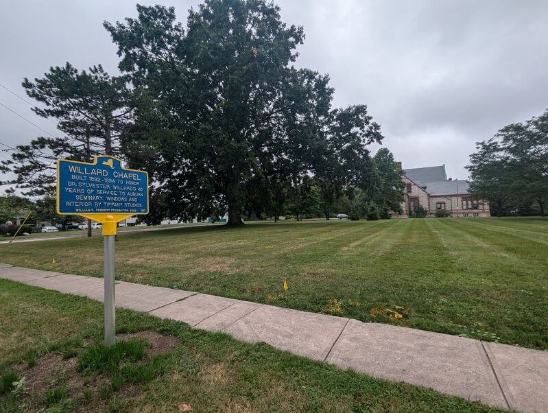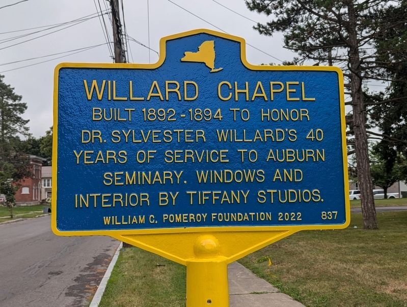 Dr. Sylvester Willard began serving as the Secretary of the Board of Trustees of Auburn Seminary in 1846. He served on the Board for more than 40 years. When Auburn Seminary built this chapel they dedicated to him for his long service. The interior and windows were designed by Jacob Holzer of Tiffany Glass company. It was erected between 1892-1894.