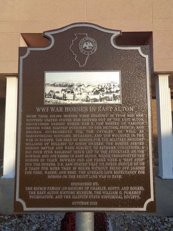 WWl WAR HORSE IN EAST ALTONMORE THAN 250,000 HORSES WERE BROUGHT IN FROM MID AND WESTERN UNITED STATES AND SHIPPED OUT OF THE EAST ALTON STOCKYARDS DURING WORLD WAR 1. THE HORSES OF VARIOUS BREEDS WERE SHIPPED OVERSEAS TO THE BRITISH, FRENCH. AND BELGIAN GOVERNMENTS FOR CAVALRY, TRANSPORTING SUPPLIES ARTILLERY, AND THE WOUNDED IN THE WAR IN EUROPE. THE SALE OF HORSES FOR THE MILITARY BROUGHT MILLIONS OF DOLLARS TO HORSE OWNERS. THE HORSES SERVED DURING BATTLE AND WERE SUBJECT TO EXTREME CONDITIONS. A BIG FOUR SPUR RAILROAD TRACK LED TO THE STOCKYARD ON THE BOWMAN AND JOB FARMS IN EAST ALTON, WHICH TRANSPORTED THE HORSES BY TRAIN. BOWMAN AND JOB FARMS WERE A ”REST STOP” FOR THE HORSES. US LAW STATED THAT NO HORSE SHOULD BE ON A TRAIN FOR MORE THAN 36 HOURS WITHOUT BEING OFF LOADED FOR FEED, WATER, AND REST. THE AVERAGE LIFE EXPECTANCY FOR HORSES 0N THE FRONT LINE WAS 30 DAYS.