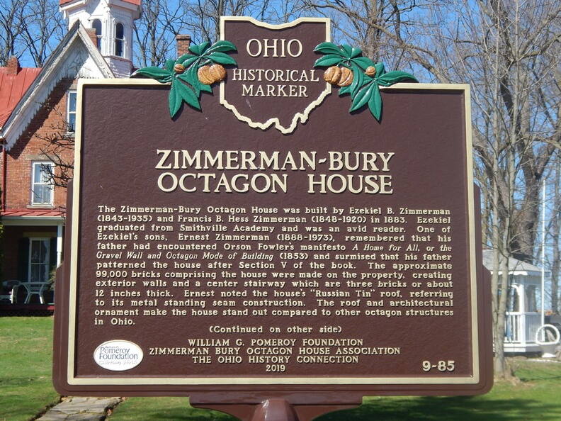 ZIMMERMAN-BURY OCTAGON HOUSEThe Zimmerman-Bury Octagon House was built by Ezekiel B. Zimmerman (1843-1935) and Francis B. Hess Zimmerman (1848-1920) in 1883. Ezekiel graduated from Smithville Academy and was an avid reader. One of Ezekiel’s sons, Ernest Zimmerman (1888-1973), remembered that his father had encountered Orson Fowler’s manifesto A Home for All, or the Gravel Wall and Octagon Mode of Building (1853) and surmised that his father patterned the house after Section V of the book. The approximate 99,000 bricks comprising the house were made on the property, creating exterior walls and a center stairway which are three bricks or about 12 inches thick. Ernest noted the house’s “Russian Tin” roof, referring to its metal standing seam construction. The roof and architectural ornament make the house stand out compared to other octagon structures in Ohio. (Continued on other side)